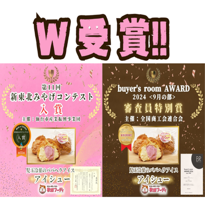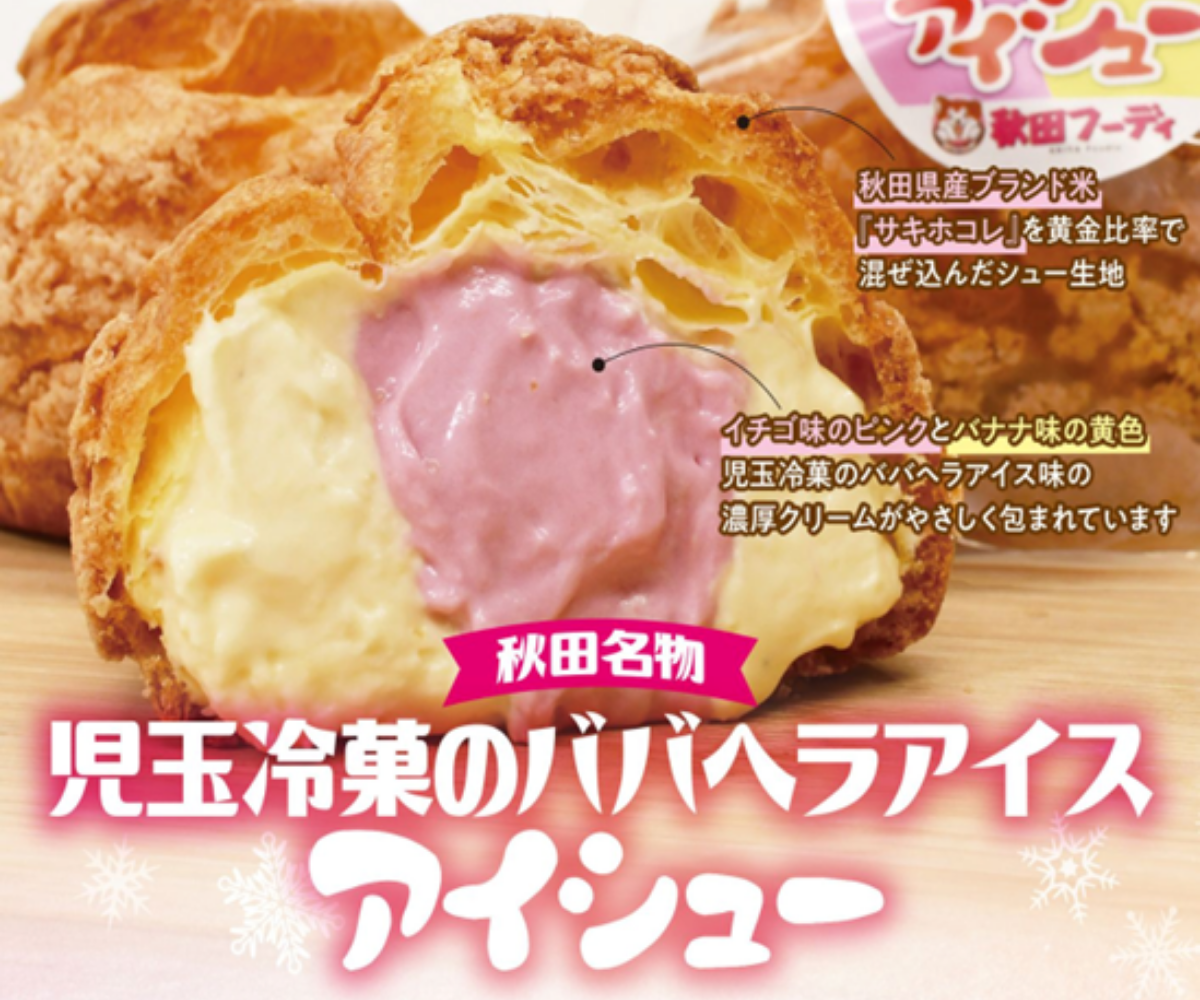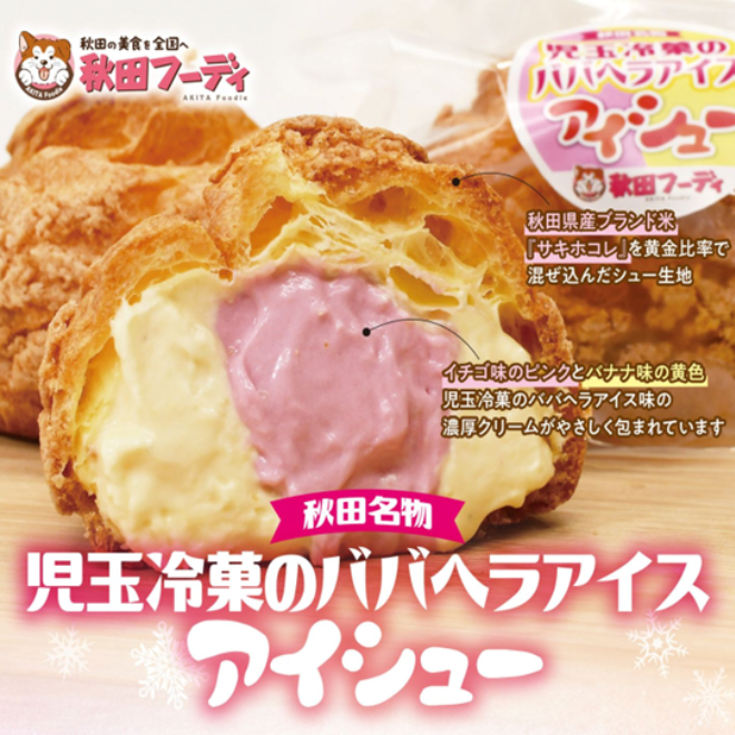 シュー生地:卵(秋田県産)、牛乳、小麦粉、マーガリン(食用植物油脂、食用精製加工油脂、発酵バター)、米粉、砂糖、食塩/乳化剤(大豆由来)、香料、ビタミンE、カロテン色素クリーム牛乳、乳等を主要原料とする食品(植物油脂、乳製品、乳糖、乳タンパク質)、卵、砂糖、小麦粉、バター、糖類(ぶどう糖果糖液糖)、いちご濃縮果汁/着色料(ラック)、酸味料、乳化剤、香料、増粘剤、pH調整剤